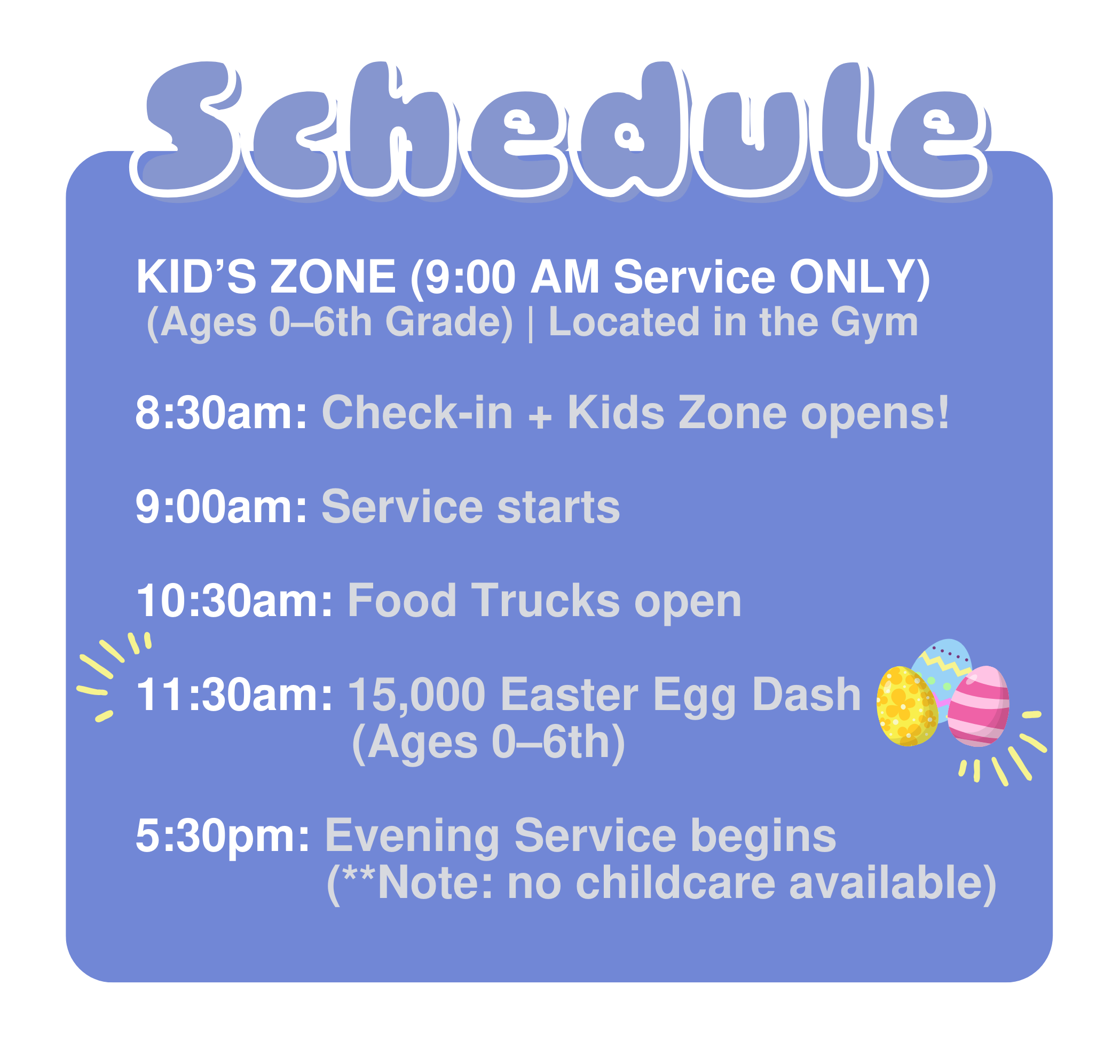 9:00am - KIDS ZONE for 0yrs - 6th Grade11:30am - 15,000 Egg Drop