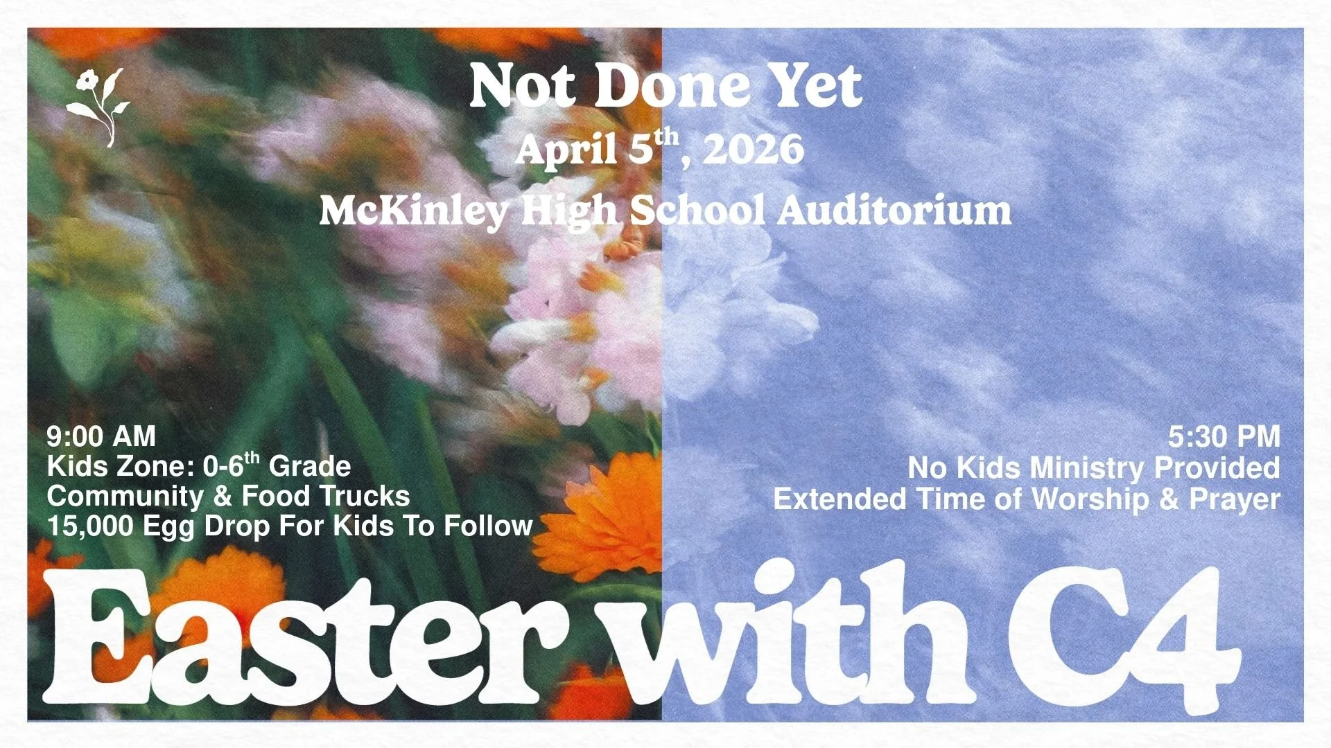 Sorry, there will be no livestream available for our Easter services. We hope you can join us in person at McKinley High School!